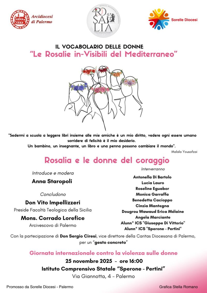 Una nuova tappa del “Vocabolario delle donne. Le Rosalie in-Visibili del Mediterraneo”: martedì 25 novembre alle ore 16.00 presso l’Istituto Comprensivo Statale “Sperone-Pertini” (via Giannotta 4, Palermo) in occasione della Giornata internazionale contro la violenza sulle donne. Un incontro, tappa di un lungo itinerario all’incontro del progetto “Sorelle Diocesi”, che rappresenta un’occasione preziosa per riflettere sul rispetto dei generi e sull’educazione all’affettività attraverso un vocabolario … Continua a leggere “Rosalia e le donne del coraggio” nella Giornata internazionale contro la violenza sulle donne. Martedi 25 novembre 2025 ore 16.00, ICS “Sperone-Pertini”. Le conclusioni dell’incontro affidate all’Arcivescovo di Palermo Mons. Corrado Lorefice