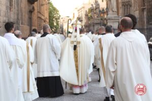 398° Festino in onore di Santa Rosalia Patrona di Palermo, 10 luglio 2022: offerta della cera da parte del Sindaco, delle Confraternite e dei fedeli alla Santuzza, S. Messa in cattedrale presieduta da Mons. Filippo Sarullo e solenne rito di uscita dell’Urna argentea della Santa dalla Cappella
