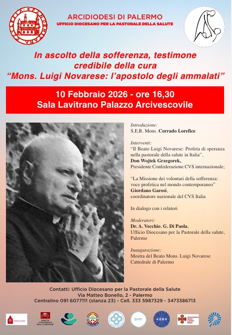 Si celebra il prossimo 11 febbraio la XXXIV Giornata Mondiale del Malato. L’Ufficio diocesano per la Pastorale della Salute propone un incontro e un’occasione di preghiera per rinnovare impegno e attenzione verso tutti coloro che vivono l’esperienza della malattia: alle ore 17.30 la Celebrazione Eucaristica in Cattedrale presieduta dall’Arcivescovo di Palermo Mons. Corrado Lorefice seguita, alle ore 19.00 da un momento di Flambaux. Questa XXXIV … Continua a leggere “La compassione del Samaritano: amare portando il dolore dell’altro”: si celebra la XXXIV Giornata Mondiale del Malato: 11 febbraio 2026