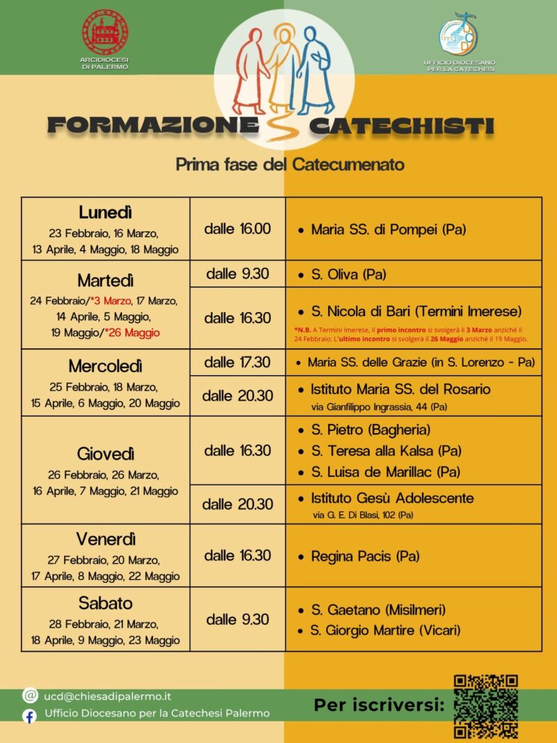 La Chiesa di Palermo si appresta a celebrare il Giubileo dei Catechisti. Mercoledì 29 Ottobre 2025 alle ore 17.00, ritrovo a Porta Nuova e Pellegrinaggio verso la Chiesa Cattedrale. Alle ore 18.00 la Celebrazione Eucaristica presieduta dall’Arcivescovo Mons. Corrado Lorefice. Il Giubileo è promosso dall’Ufficio Catechistico diocesano.