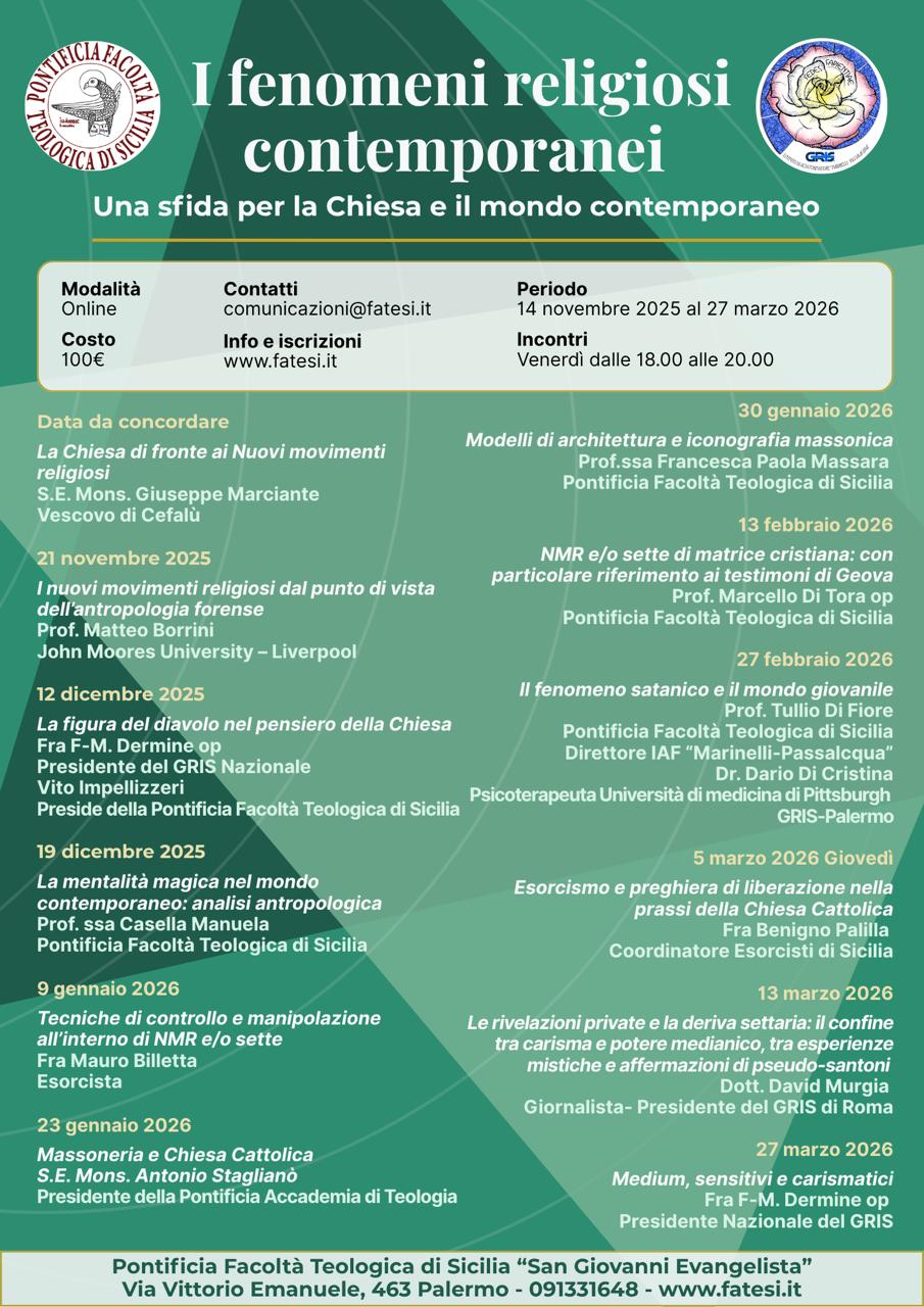 calendario diocesano 19 Novembre 2025 G.R.I.S. I fenomeni religiosi contemporanei - Una sfida per la Chiesa e il mondo contemporaneo venerdì 23 Gennaio Descrizione: Massoneria e Chiesa Cattolica online email: iaf-mp@gris.org email: comunicazioni@fatesi.it Inizio: 23/01/2026 18:00 Fine: 23/01/2026 20:00 Categorie: calendario diocesano Allegati: Locandina-7.jpg Città: Palermo Regione: Sicilia Paese: Italia