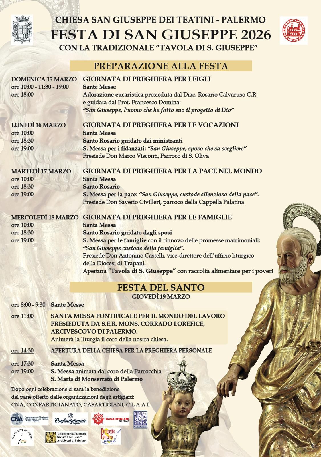 calendario diocesano 9 Marzo 2026 Solennità Solennità di S. Giuseppe giovedì 19 Marzo Descrizione: Chiesa S. Giuseppe ai Teatini Inizio: 19/03/2026 08:00 Fine: 19/03/2026 20:00 Categorie: calendario diocesano Allegati: Locandina.jpg Città: Palermo Regione: Sicilia Paese: Italia